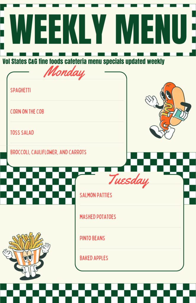 Weekly Cafeteria Menu By SettlerOnline on February 20, 2024 Published in Vol State News c and g fine foodsCafeteriaDelaney HolmanVolunteer State Community CollegeVSCCVSCC Vol State SettlerOnline More from Vol State NewsMore posts in Vol State News »‘History At the Movies’: Vol State Screens The Patriot at The Palace Theater‘History At the Movies’: Vol State Screens The Patriot at The Palace TheatereLearn Master: Star Boe!eLearn Master: Star Boe!PSA: Watch Your Halloween CandyNew Sports at Vol StateNew Sports at Vol StateThe Art of HistoryThe Art of History
